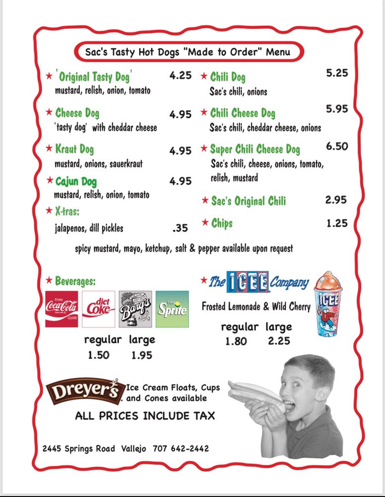 Experience the nostalgic charm of Sac’s Tasty Hot Dogs located in Vallejo, CA. With a menu that includes classic hot dog options like the Cheese Dog and the Sacs Original Tasty Dog, this women-owned establishment is a must-visit for hot dog lovers. Customers rave about the generous portions, friendly service, and delicious hot dogs. Situated in a 1950s hot dog culture ambiance, Sac’s Tasty Hot Dogs offers a unique dining experience. You can even enjoy outdoor seating with heated and covered options. Whether you stop by for lunch, takeout, or catering, Sac’s Tasty Hot Dogs is sure to satisfy your hot dog cravings. Don't miss out on their fresh watermelon and baked goods offerings, making your visit even more enjoyable. Treat yourself to a memorable hot dog experience at Sac’s Tasty Hot Dogs today.